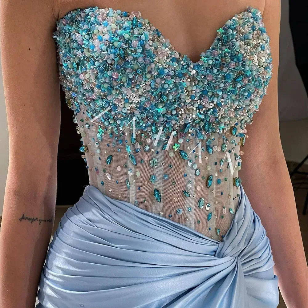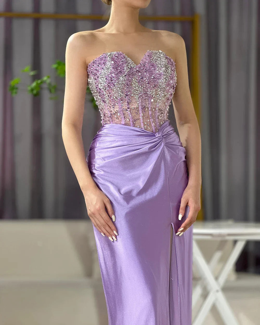 Robe de soirée de luxe style sirène lilas, fendue, sans bretelles, avec perles, style arabe, pour femmes, fête de mariage, 2025, LA72329