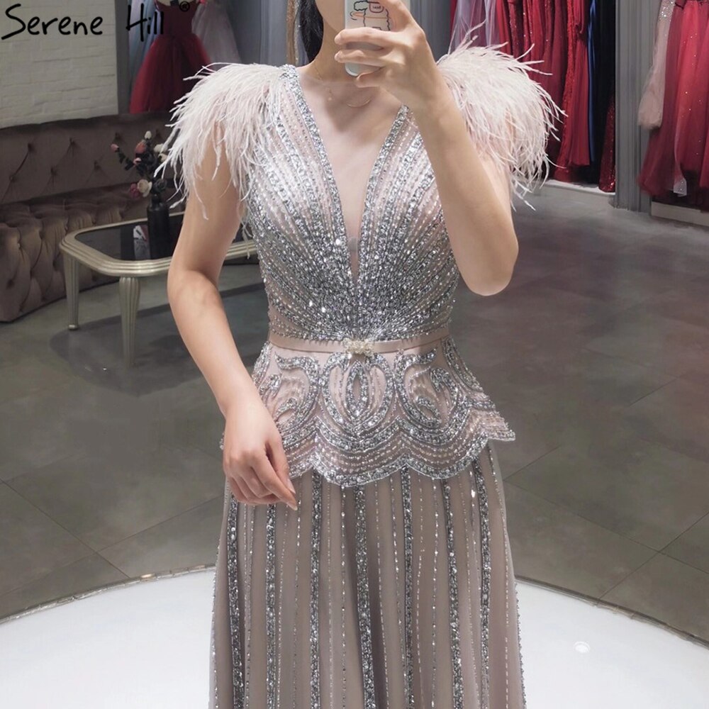 Robe de soirée de luxe rose chair, robe trapèze à perles et plumes, pour femme, LA70929, 2025