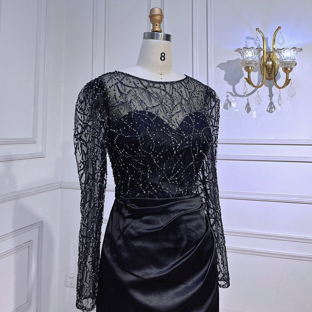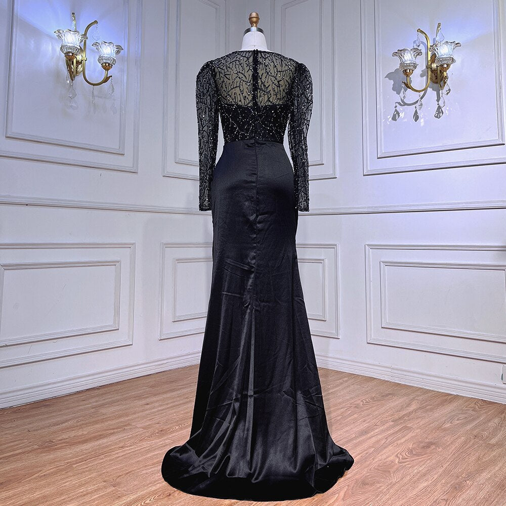 Robe de soirée sirène noire musulmane en satin perlé, luxueuse, tenue de soirée de Dubaï, 2025, pour femme, fête de mariage, LA72040