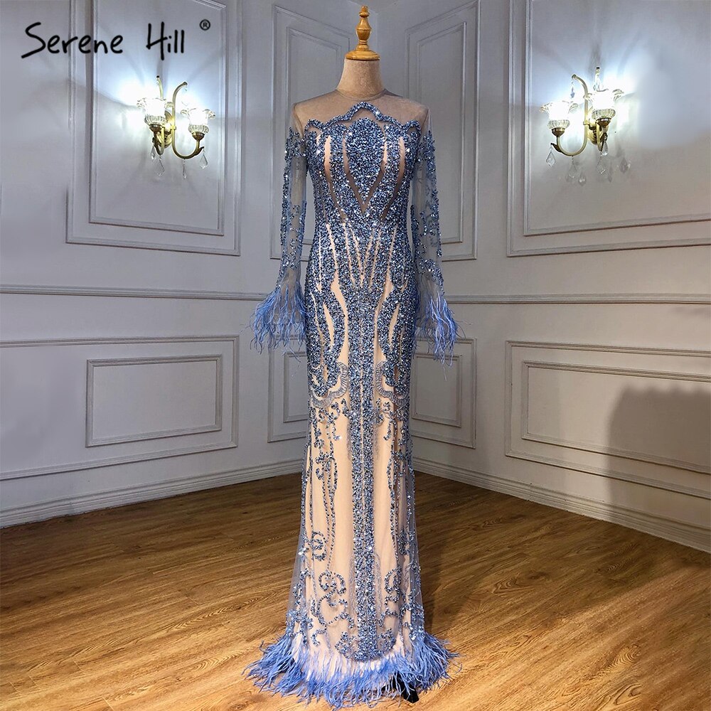 Robe de soirée sirène bleue amovible, style musulman, avec plumes et perles, luxueuse, pour femmes, LA60932A, 2025