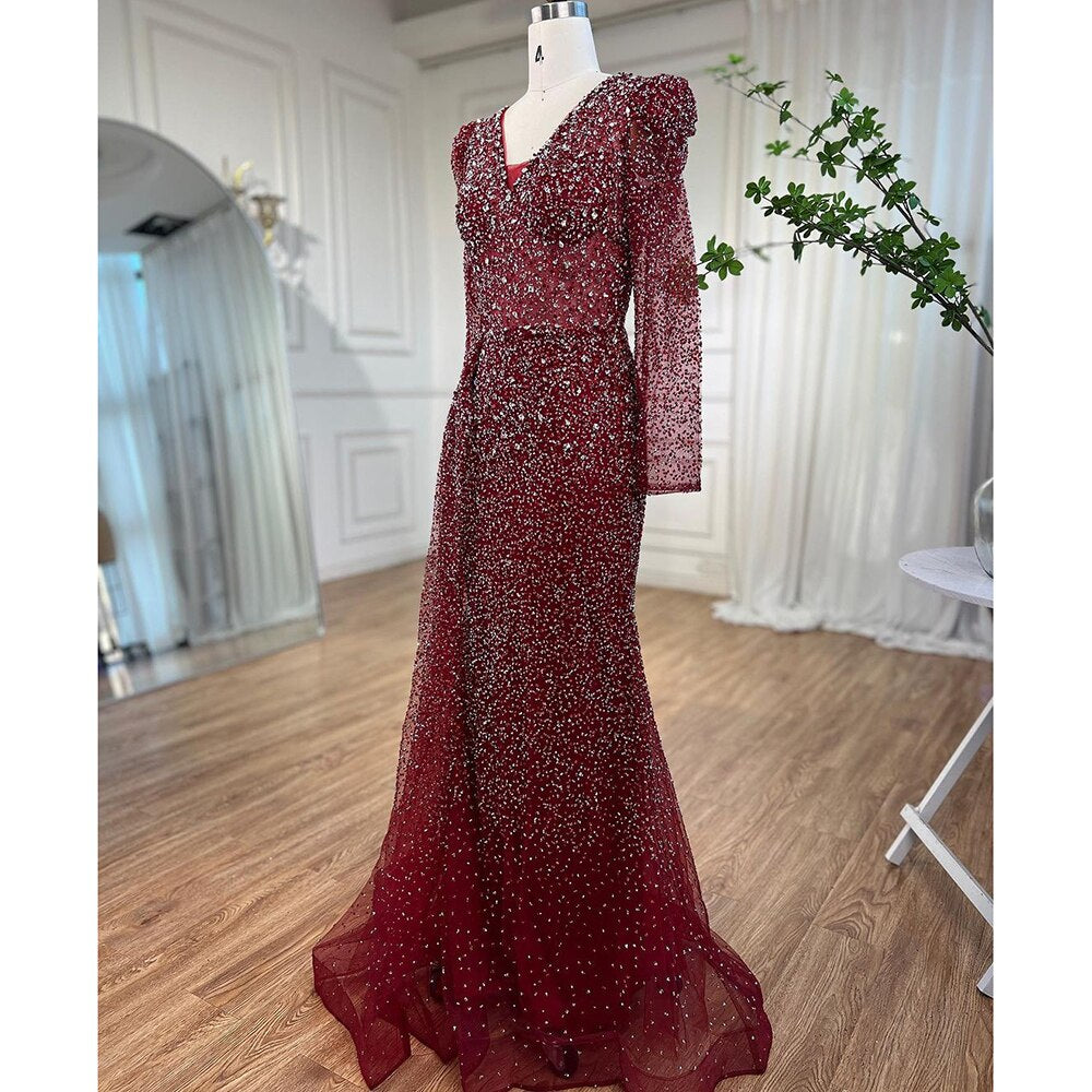 Robe de soirée sirène rouge vin de luxe, col en V, perles, pour femmes musulmanes, tenue de mariage, 2025, LA72148