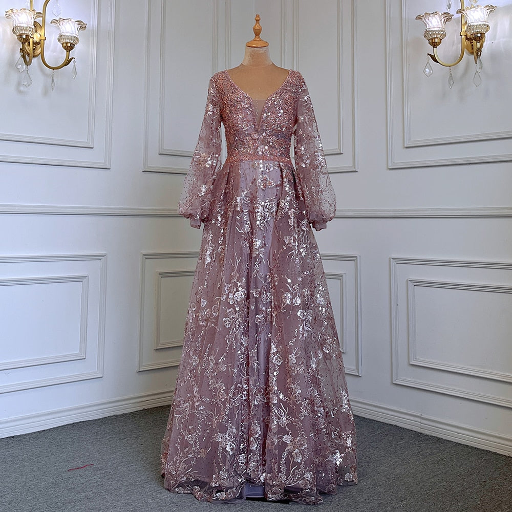 Robe de soirée sirène dorée, élégante, manches bouffantes, col en V, luxueuse, ornée de perles, pour femmes musulmanes, LA71761, 2025