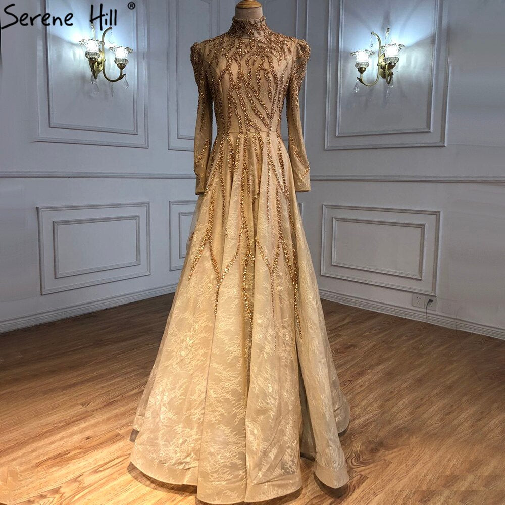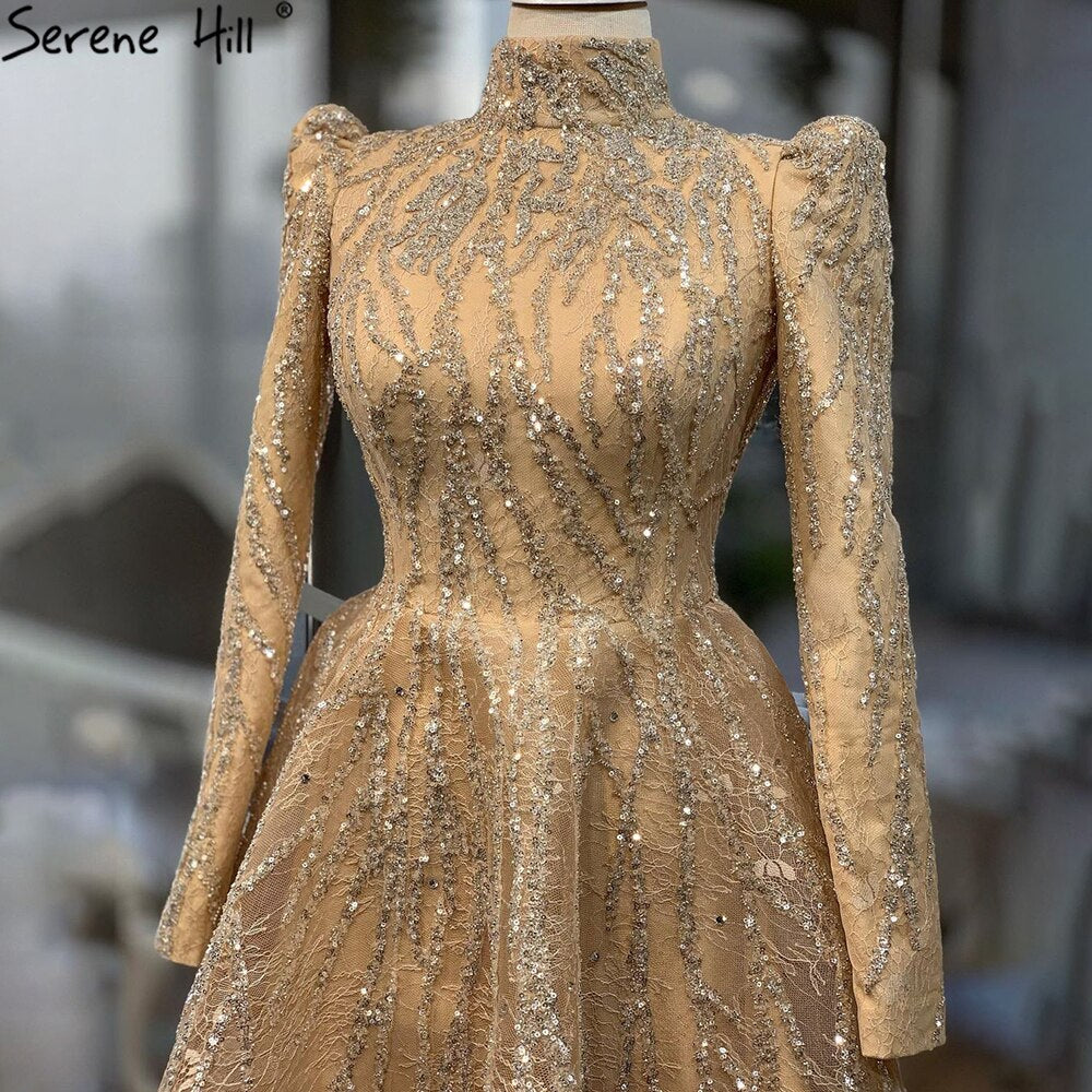 Robe de soirée musulmane dorée scintillante, longueur cheville, perles, coupe trapèze, pour femmes, LA70996, 2025