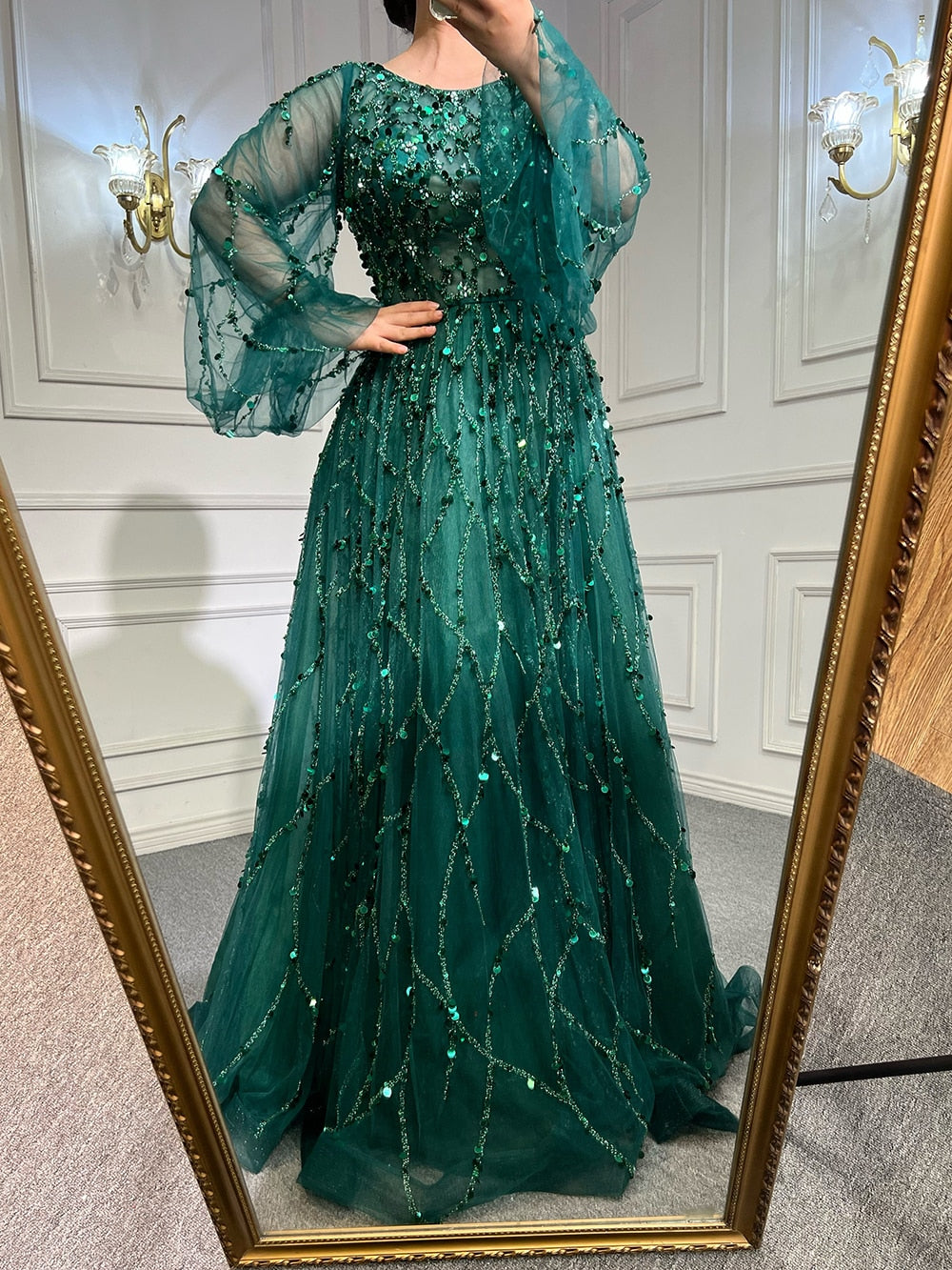 Robe de soirée de luxe verte style musulman, coupe trapèze, col rond, manches bouffantes, perles, sexy, formelle, pour femme, LA71049A, 2025