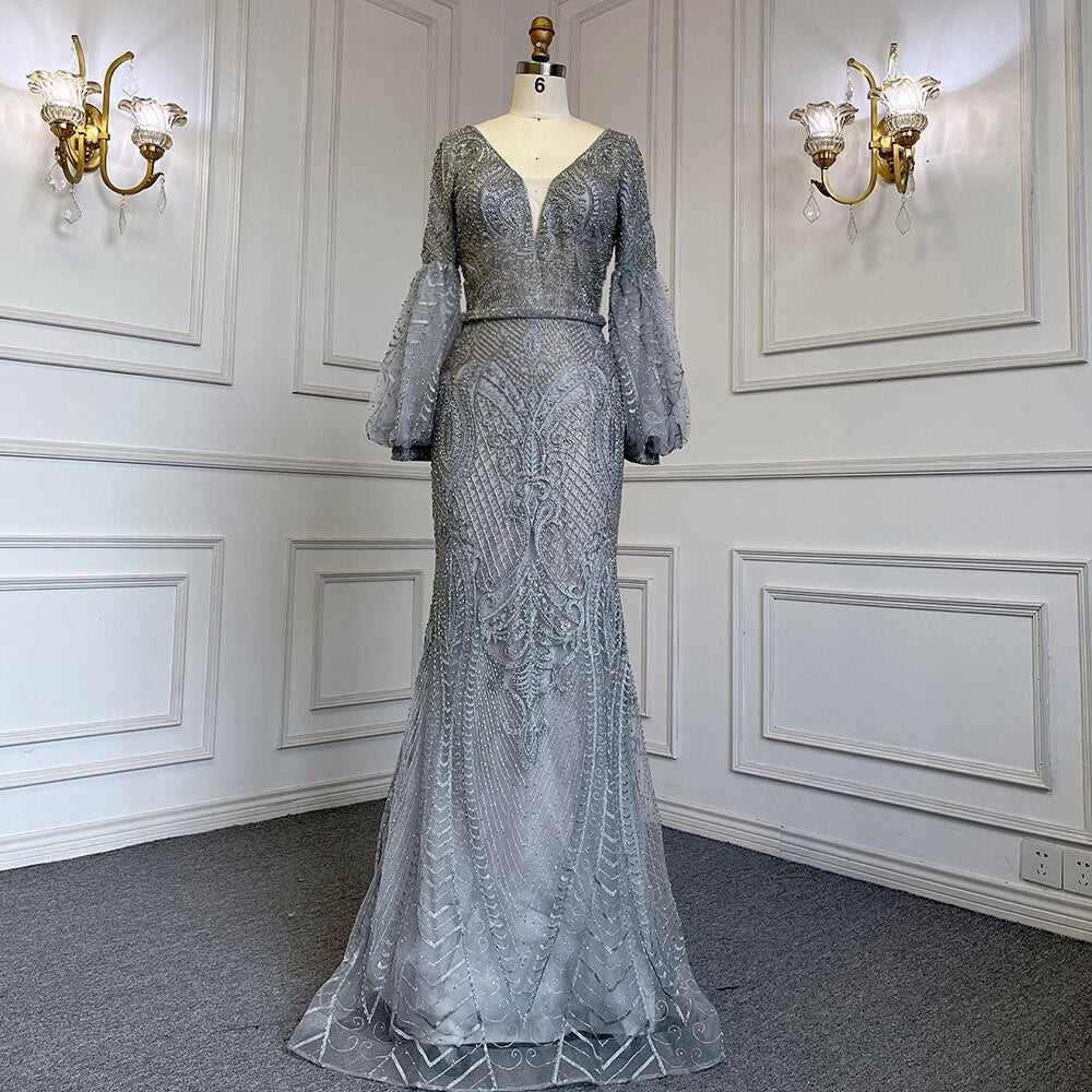 Robe de soirée sirène verte musulmane élégante, manches bouffantes, col en V, luxueuse, perlée, pour femmes, LA71744