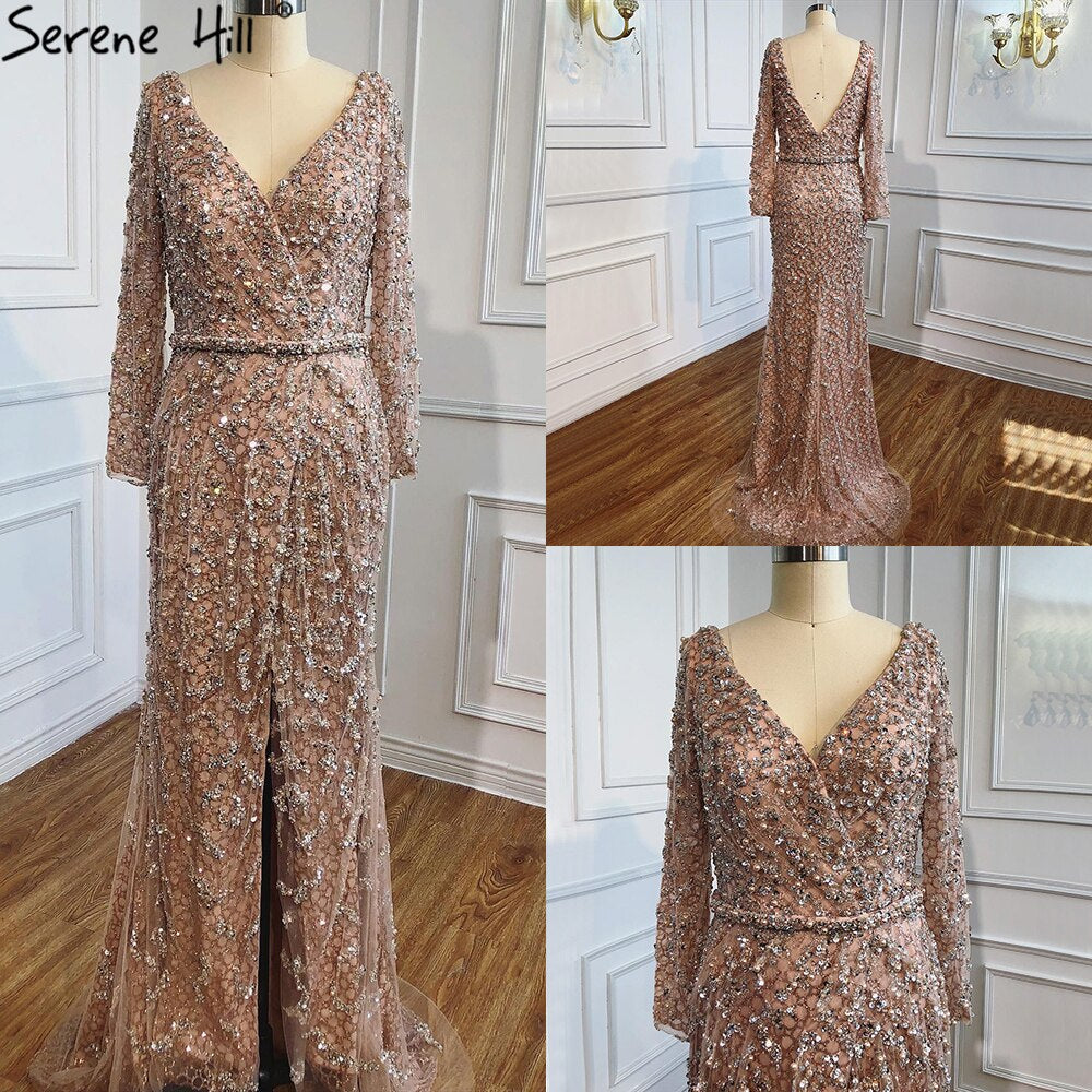 Robe de soirée sirène pêche à col en V, manches longues, perles, modèle LA70499, 2025