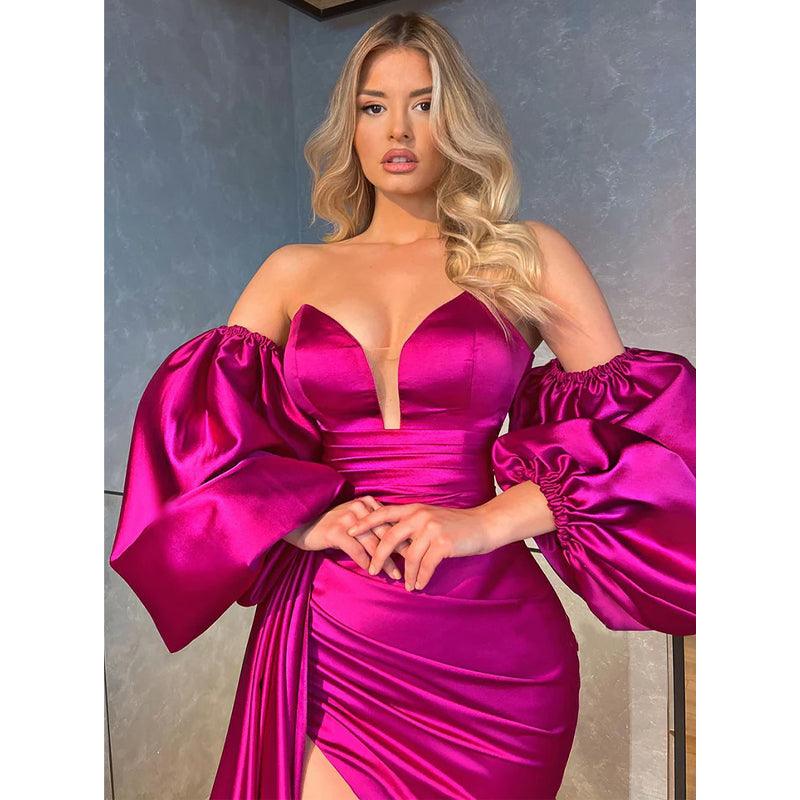 Robe de soirée longue en satin rose, sexy, décolleté en V, sans bretelles, manches bouffantes et fente haute