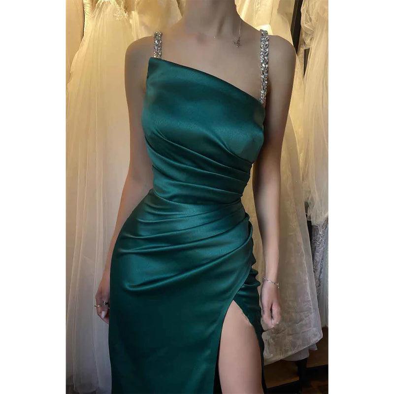 Robe de soirée longue verte à bretelles et perles, coupe fourreau/colonne, avec fente
