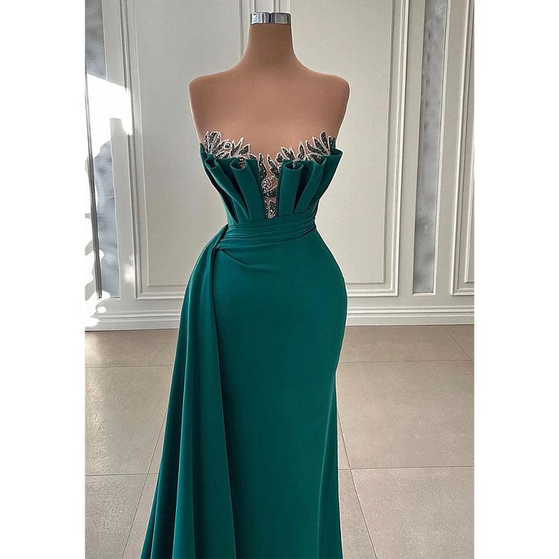 Robe de soirée longue sans bretelles à perles vertes, fourreau/colonne