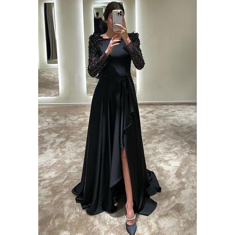 Robe de soirée fourreau/colonne carrée en satin à manches longues et appliques