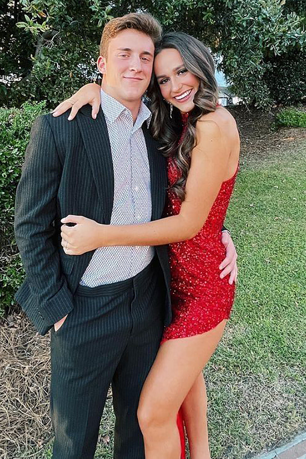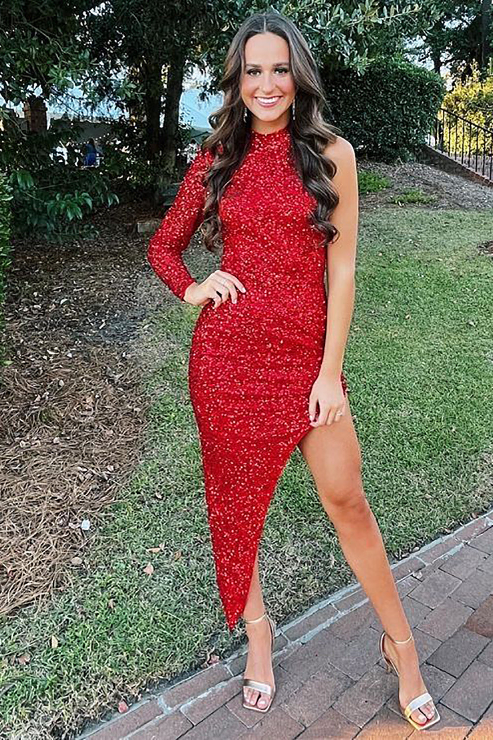 Robe fourreau asymétrique à sequins rouges et col montant pour le bal de promo