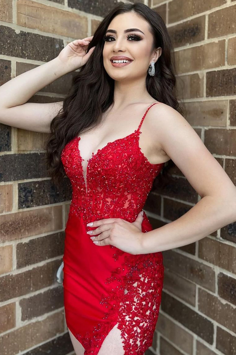 Robe de bal courte rouge fourreau à fines bretelles et appliques
