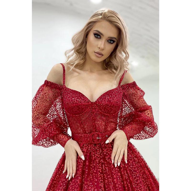 Robe de bal scintillante à bretelles spaghetti et manches longues