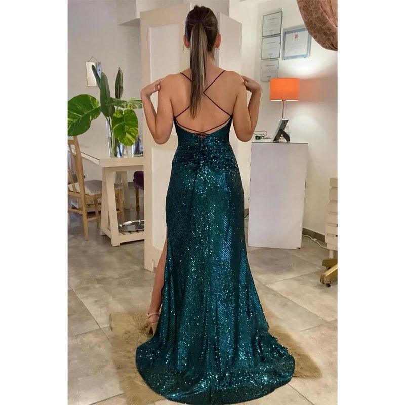 Robe de soirée sirène à bretelles spaghetti, paillettes et plis avec fente