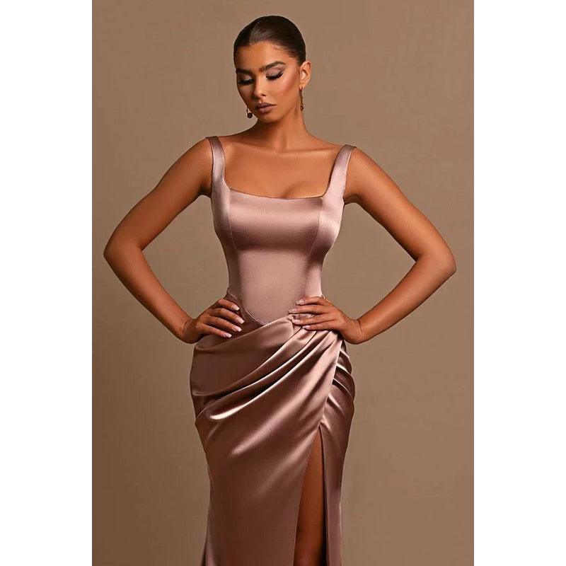 Robe de soirée longue froncée à col carré et fente sur la cuisse