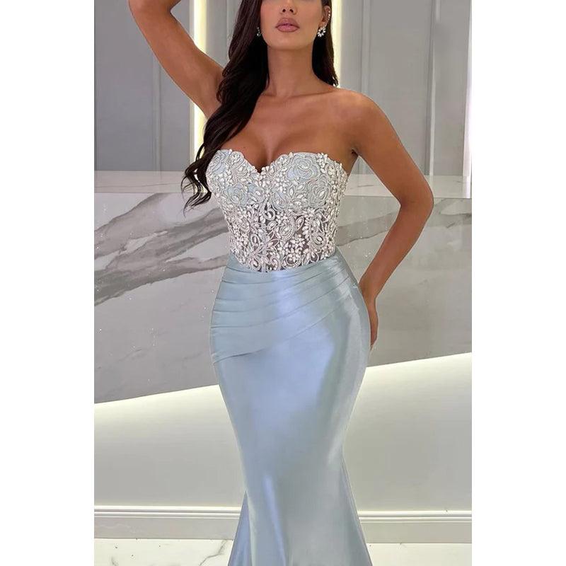 Robe de soirée longue sirène en satin à perles et appliqués, sans bretelles