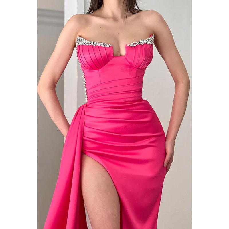 Robe de bal longue en satin froncé, bustier, perles et fente