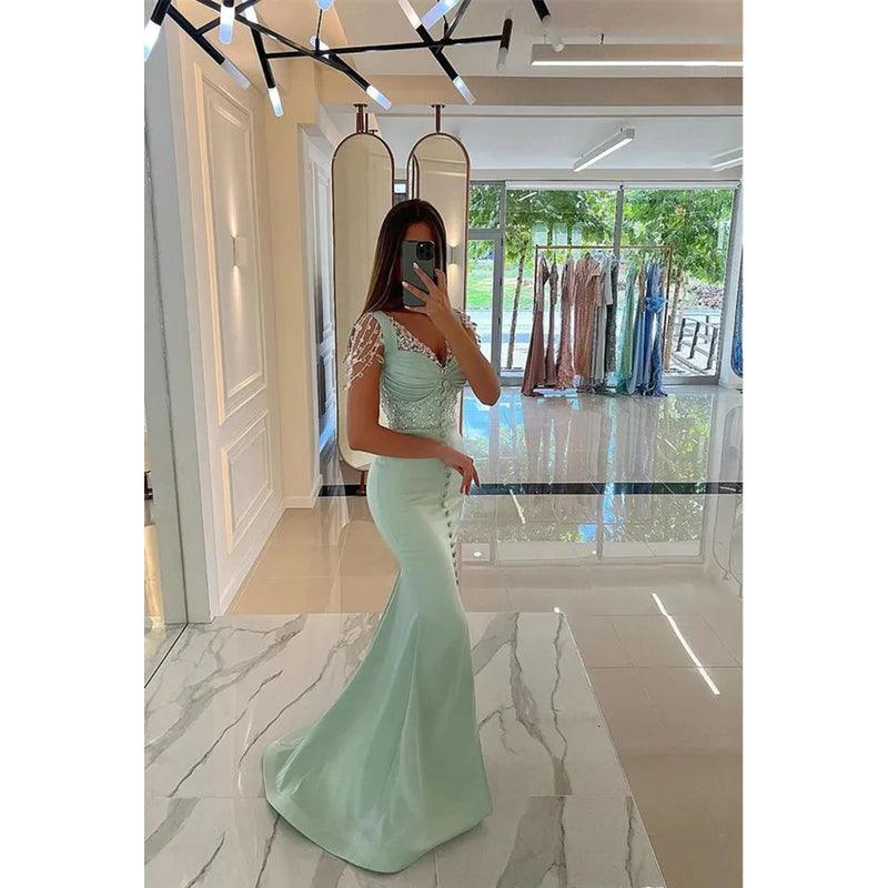 Robe de bal longue sirène en satin perlé avec décolleté en cœur et fente