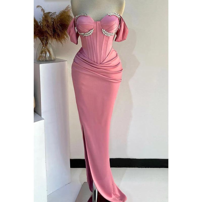Robe de soirée à épaules dénudées et froncée avec perles et fente latérale