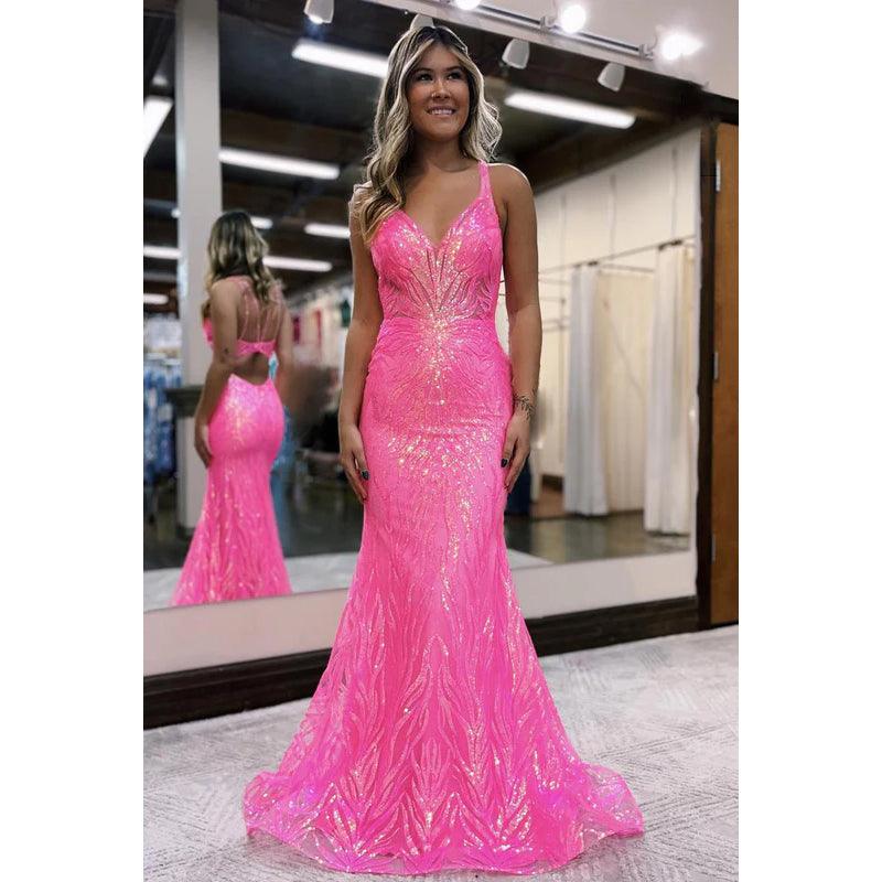 Robe de soirée sirène à paillettes et col en V, coupe trompette et bretelles ornées