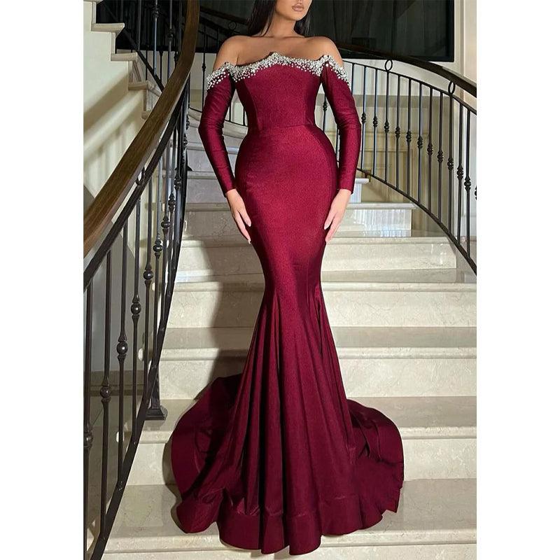 Robe de soirée trompette à épaules dénudées et manches longues, ornée de perles et d'une traîne
