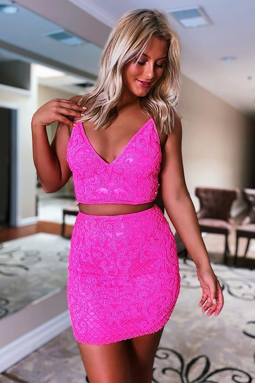 Robe courte deux pièces à fines bretelles et appliques, idéale pour un bal de promo.
