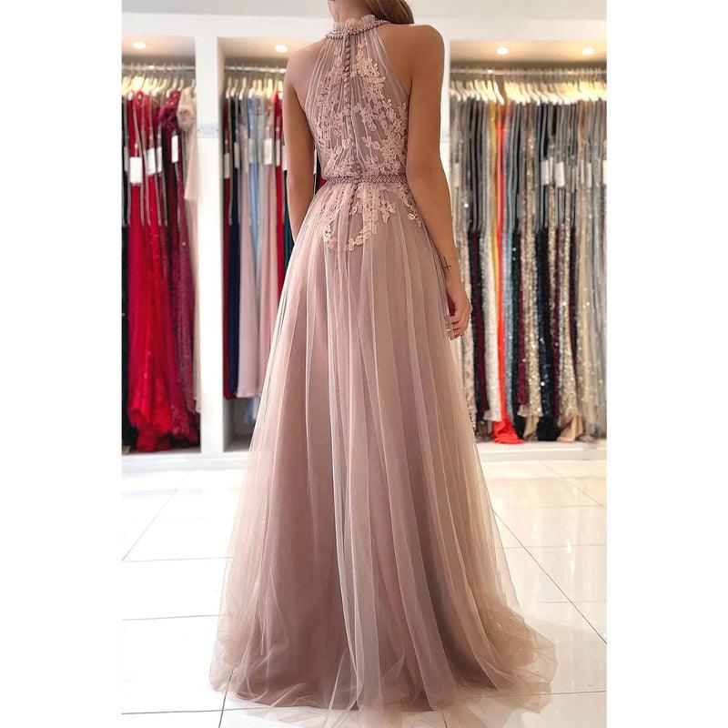 Robe de soirée élégante en tulle avec appliques en dentelle et décolleté haut