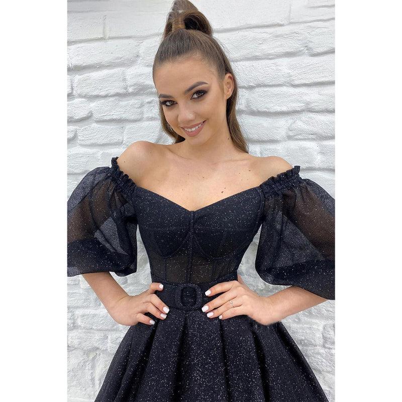 Robe de bal scintillante unique à épaules dénudées et manches mi-longues
