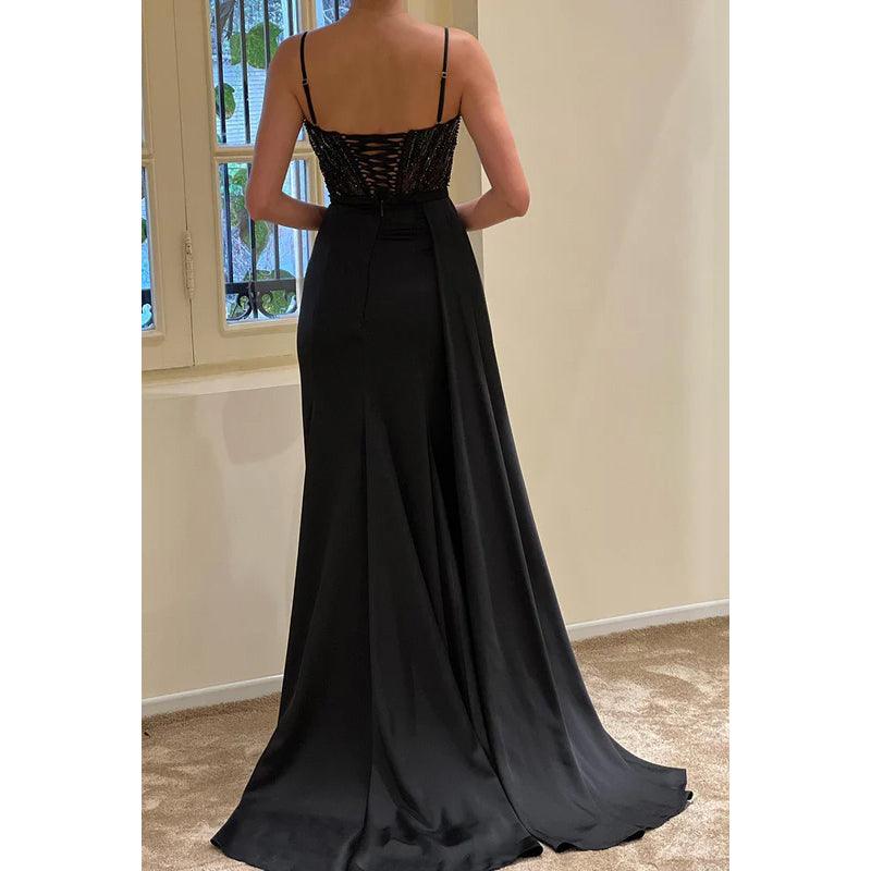 Robe de soirée longue à col en V, bretelles spaghetti, froncée et perles