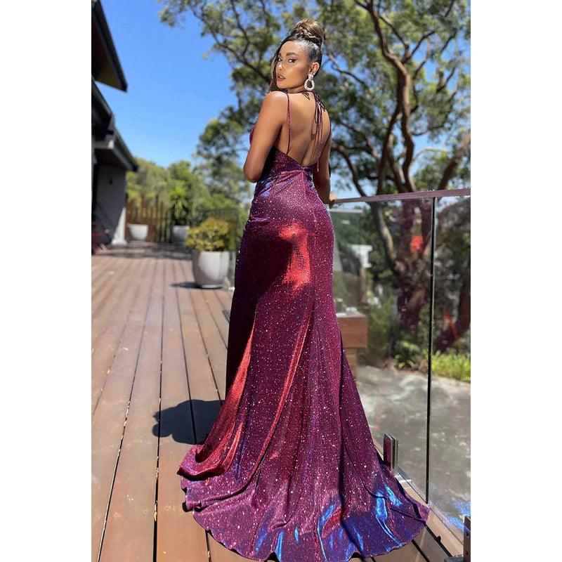 Robe de bal longue à bretelles spaghetti et col en V, froncée et scintillante