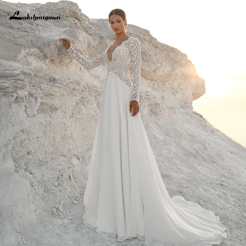 Nom de marque : lakshmigown Images réelles : Oui Encolure : Col en V Longueur des manches (cm) : Longue Tissu de la robe de mariée : mousseline Train : Train de balayage/de brosse Origine : CN (Origine) Pour les femmes enceintes : Oui Longueur des robes : Longueur au sol Conception du dos : fermeture éclair Type d'article : Robes de mariée Style de manche : épaules dénudées Soutien-gorge intégré : Oui is_customized: Oui Décoration : Dentelle Élément de mode : simple Tour de taille : Naturel Silhouette : A-LINE Marché : Robe de mariée. robe de casamento Couleur : Blanc Ivoire ou sur mesure à partir de notre nuancier Grande taille : grande taille ou taille sur mesure abiti da sposa: trouwjurk / gelinlik style : robes de soirée de mariage Saison : Printemps.Été.Automne.Hiver Fête de mariage Plage : robe de plage de mariage