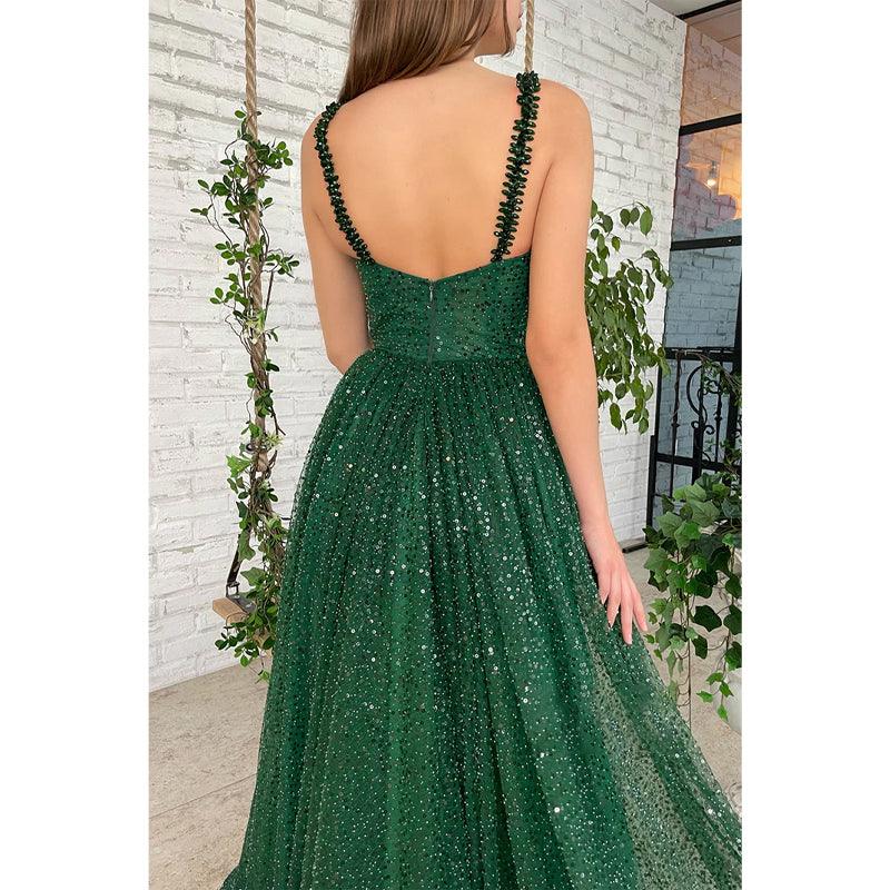 Robe de bal longue verte scintillante à bretelles spaghetti et paillettes avec poches pour femme