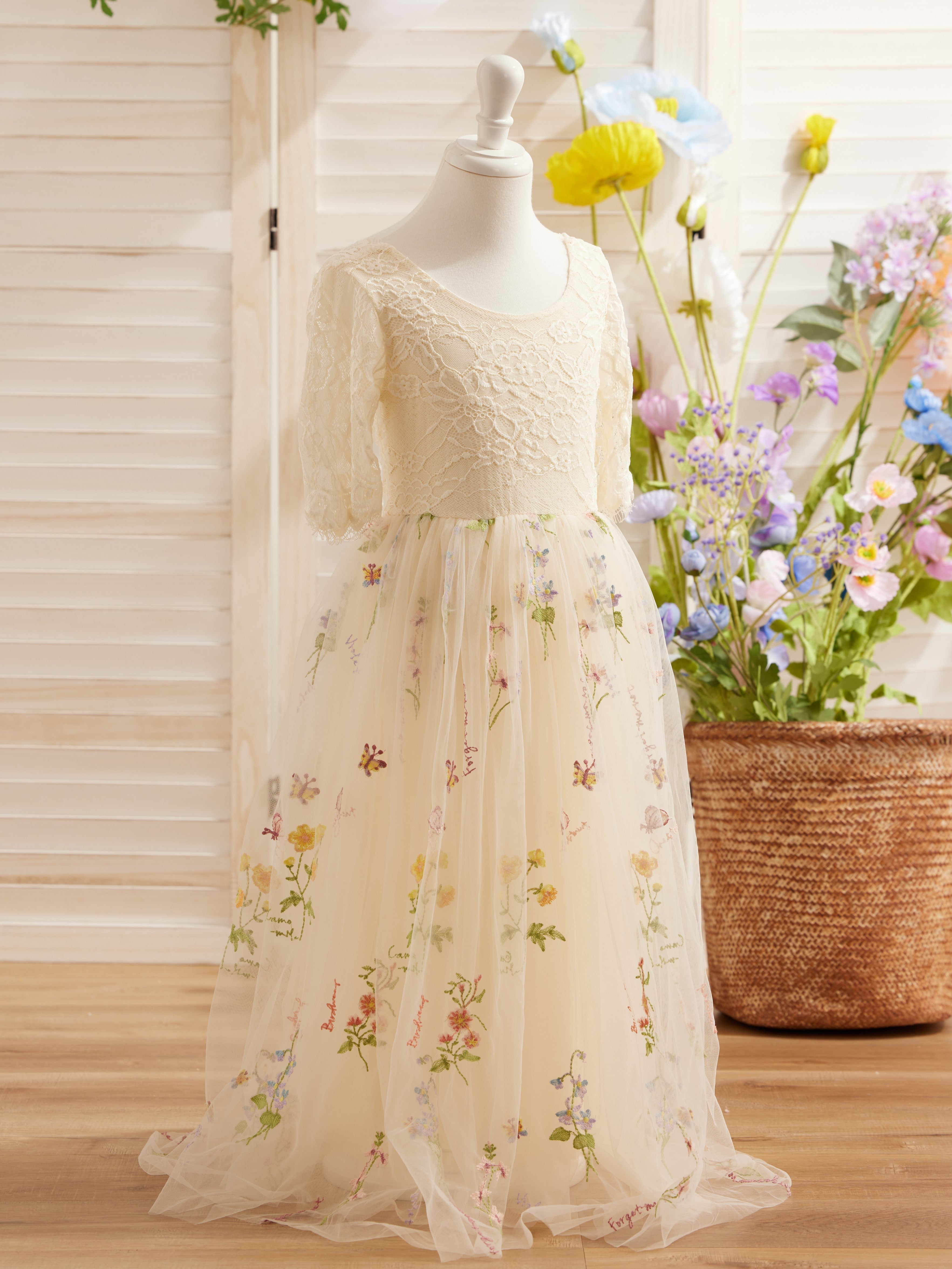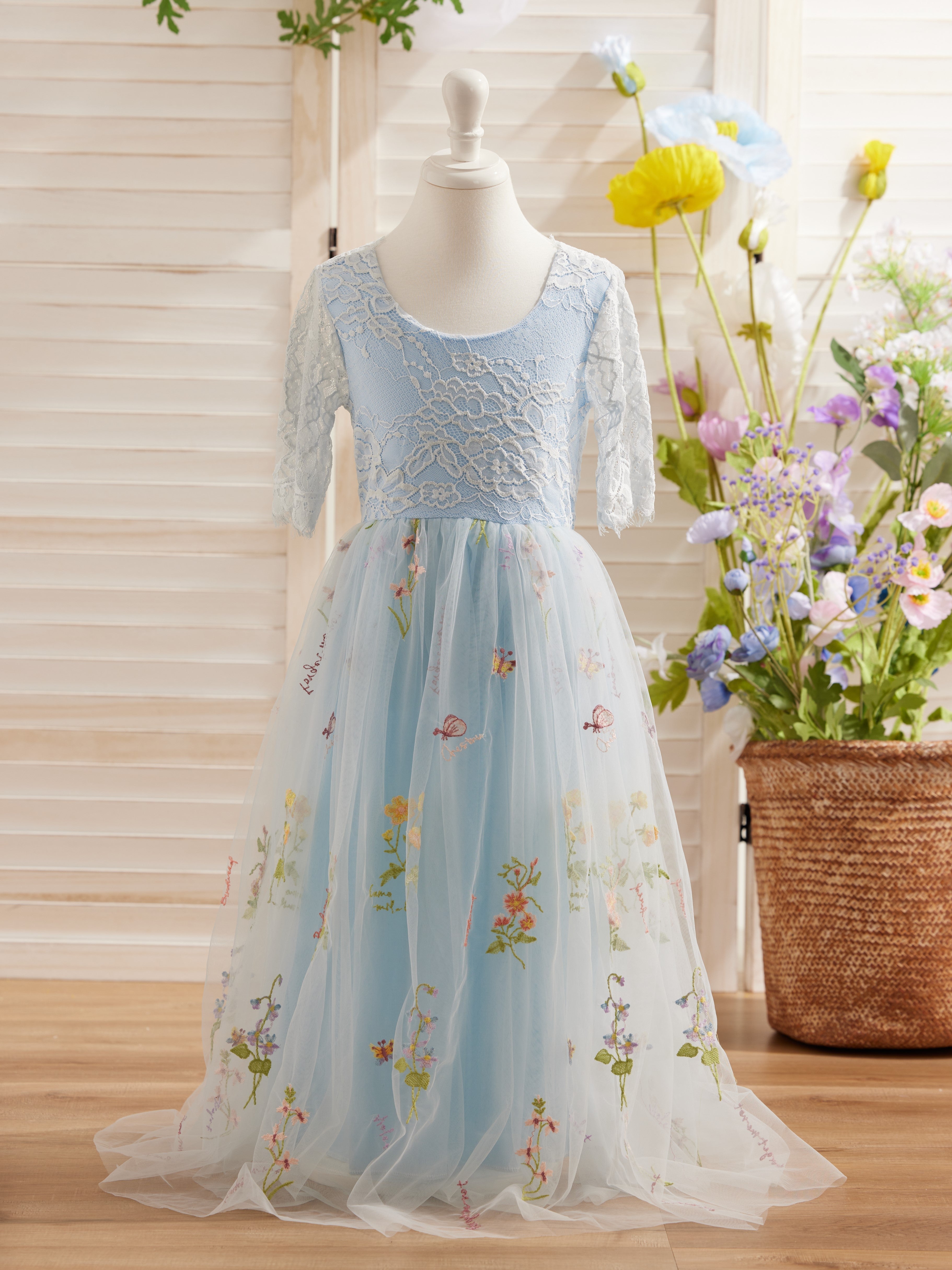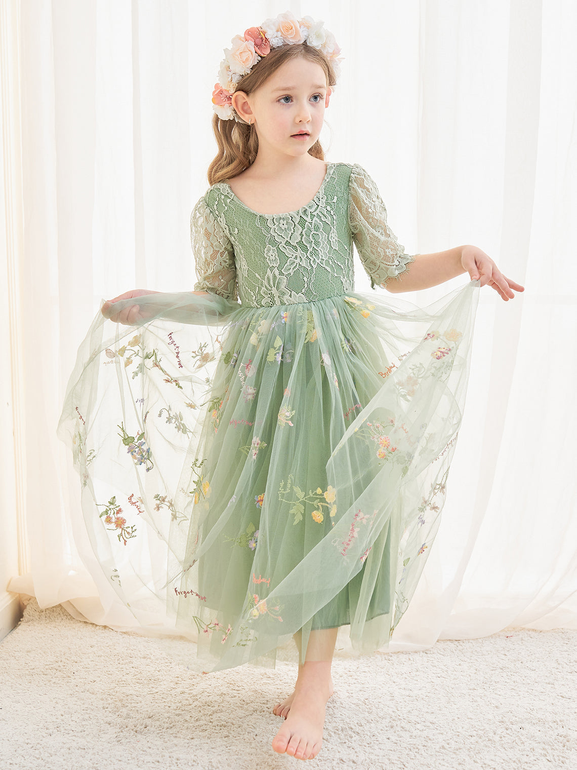 Sage Scoop Neck Cloth Surface and Tulle Flower Girl Dress (2003227581)