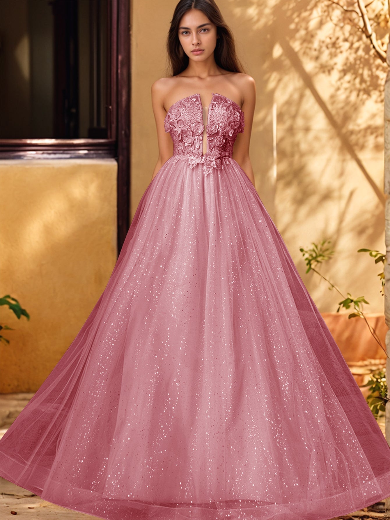 3D Rose Embroidery Sparkly Lace Plunging Ball Gown Prom Dress