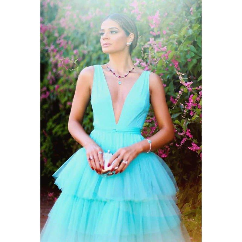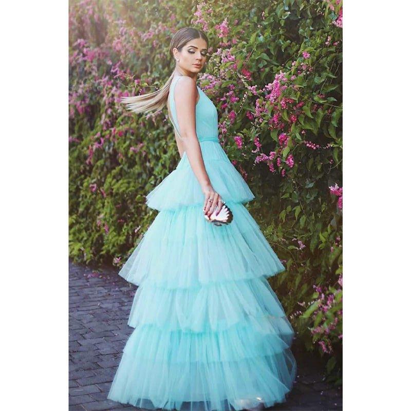 A-line Attractive V-neck Tulle Tiered Long Prom Dress Formal Evening Gowns
