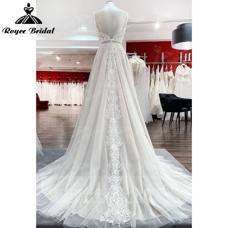 A Line Boho Blush Color Wedding Dress Spaghetti Straps Lace Tulle V Neck Sleeveless Open Back