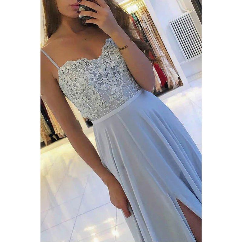 A-line Chiffon Appliques Spaghetti Straps High Split Long Formal Evening Dress