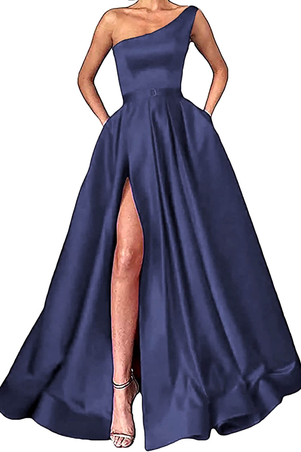 A Line One Shoulder Champagne Long Prom Dress with Slit