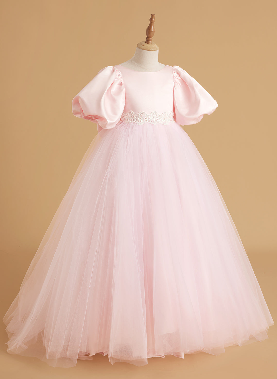 A-line Satin Tulle Short Sleeves Flower Girl Dress