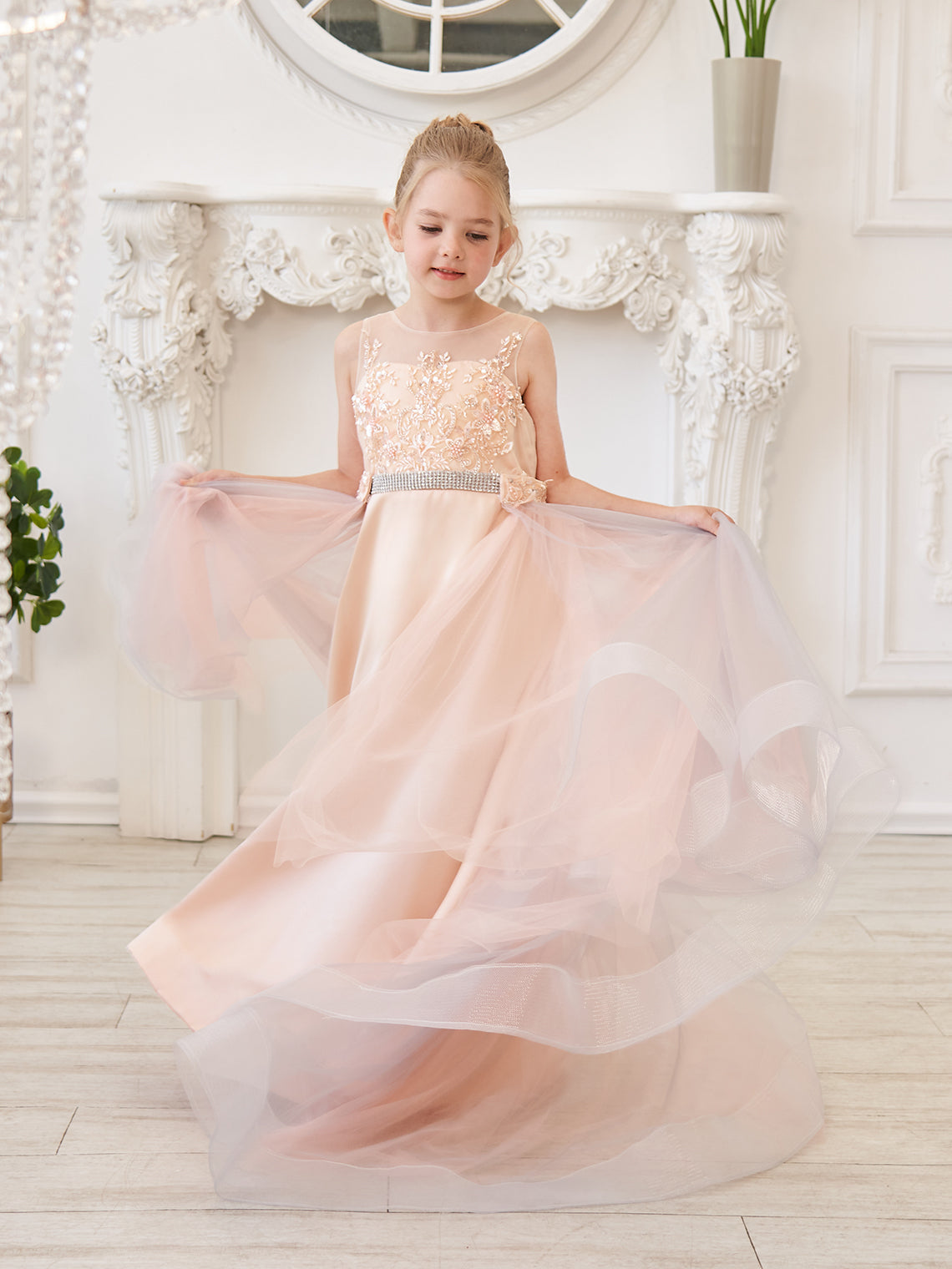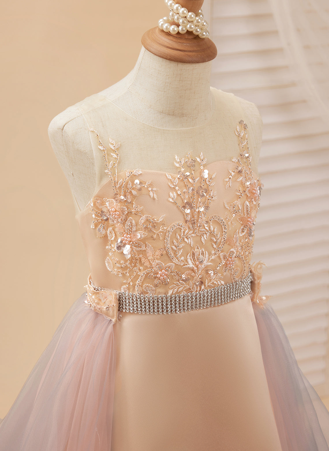 A-line Satin Tulle Sweep Train Champagne Dress (010226776)