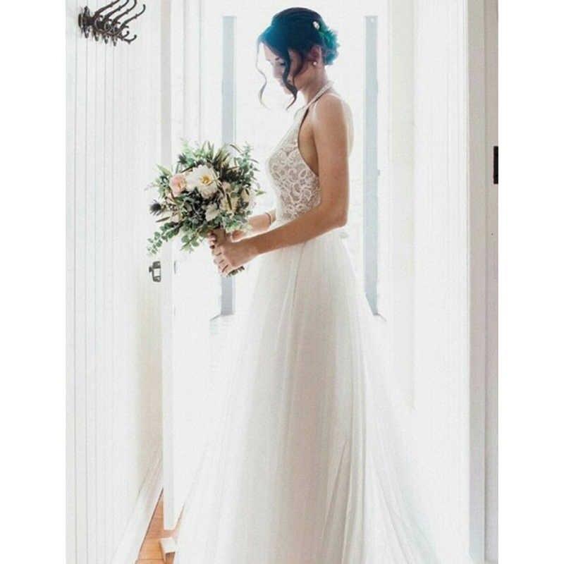 A-Line Round Neck Sweep Train Tulle Wedding Dress with Lace WD390