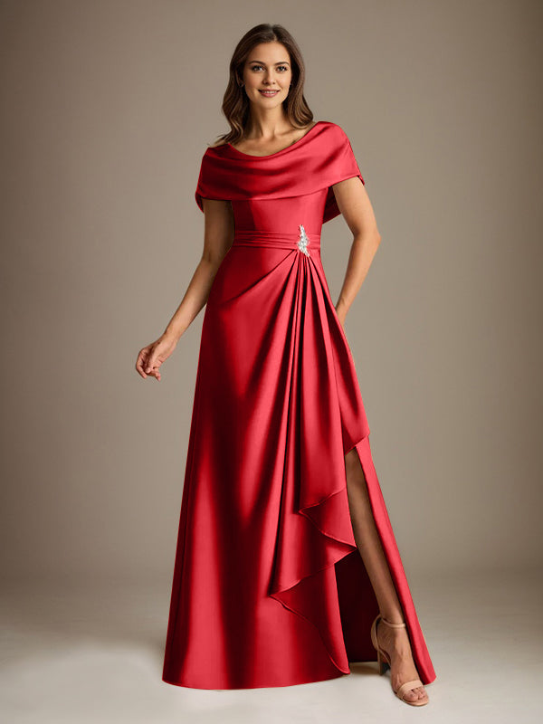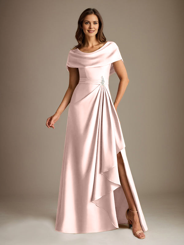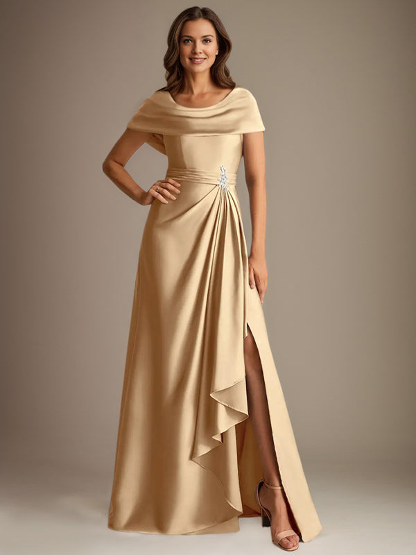 A-Line Scoop Floor-Length Stretch Satin Mother of the Bride Dress With Cascading Ruffles