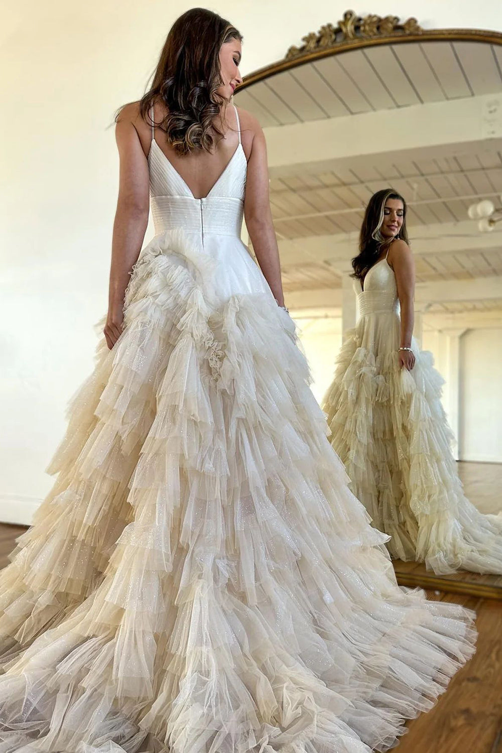 A Line Spaghetti Straps Pink Long Prom Dress with Ruffles