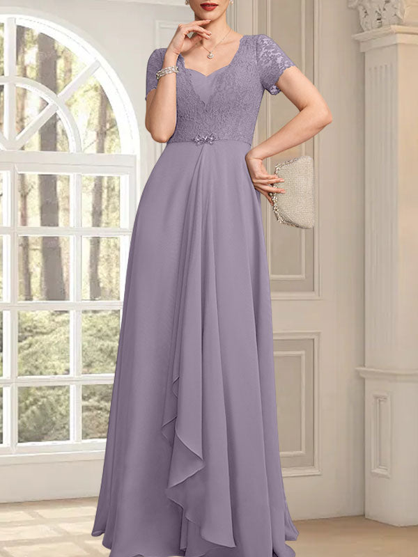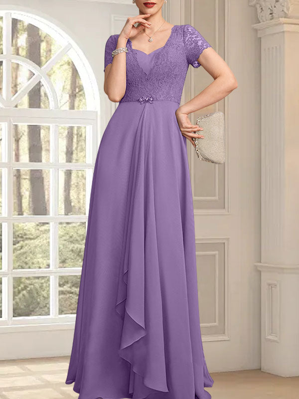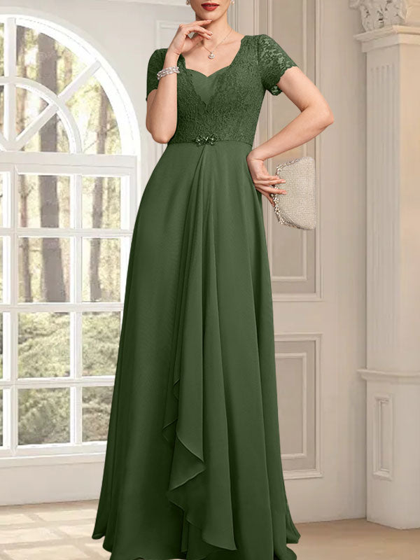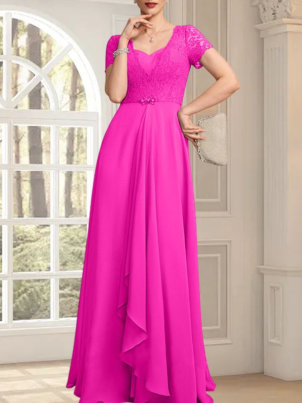 A-line Sweetheart Floor-Length Chiffon Lace Mother of the Bride Dress With Beading Cascading Ruffles