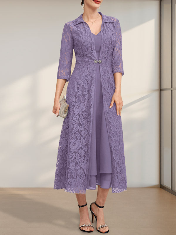 A-line V-Neck Tea-Length Chiffon Mother of the Bride Dress