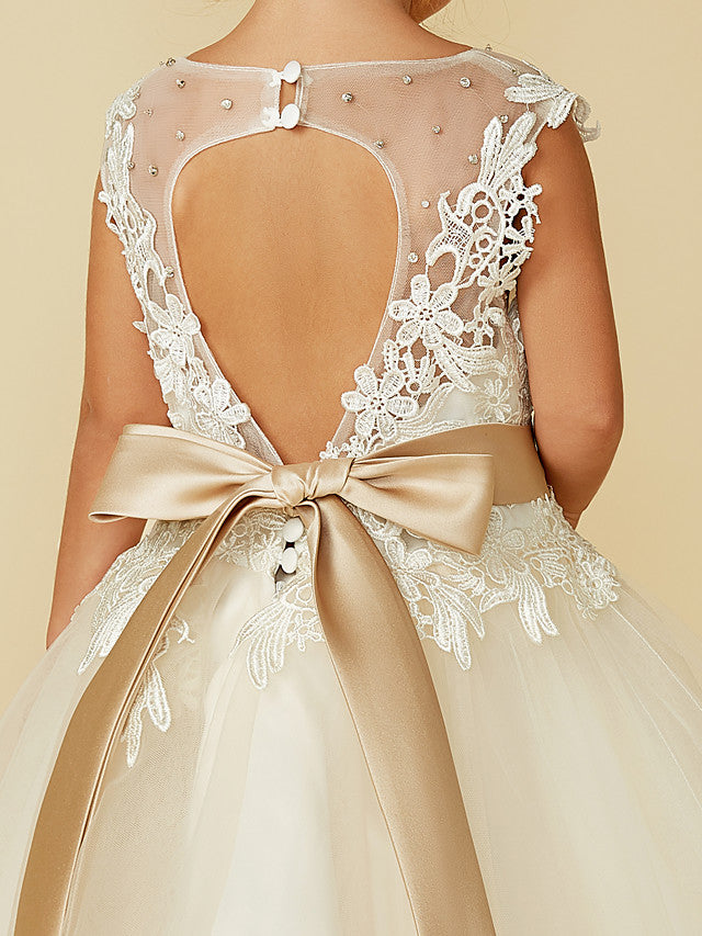 Ball Gown Lace Tulle Sleeveless Jewel Neck Wedding Party Pageant Flower Girl Dresses