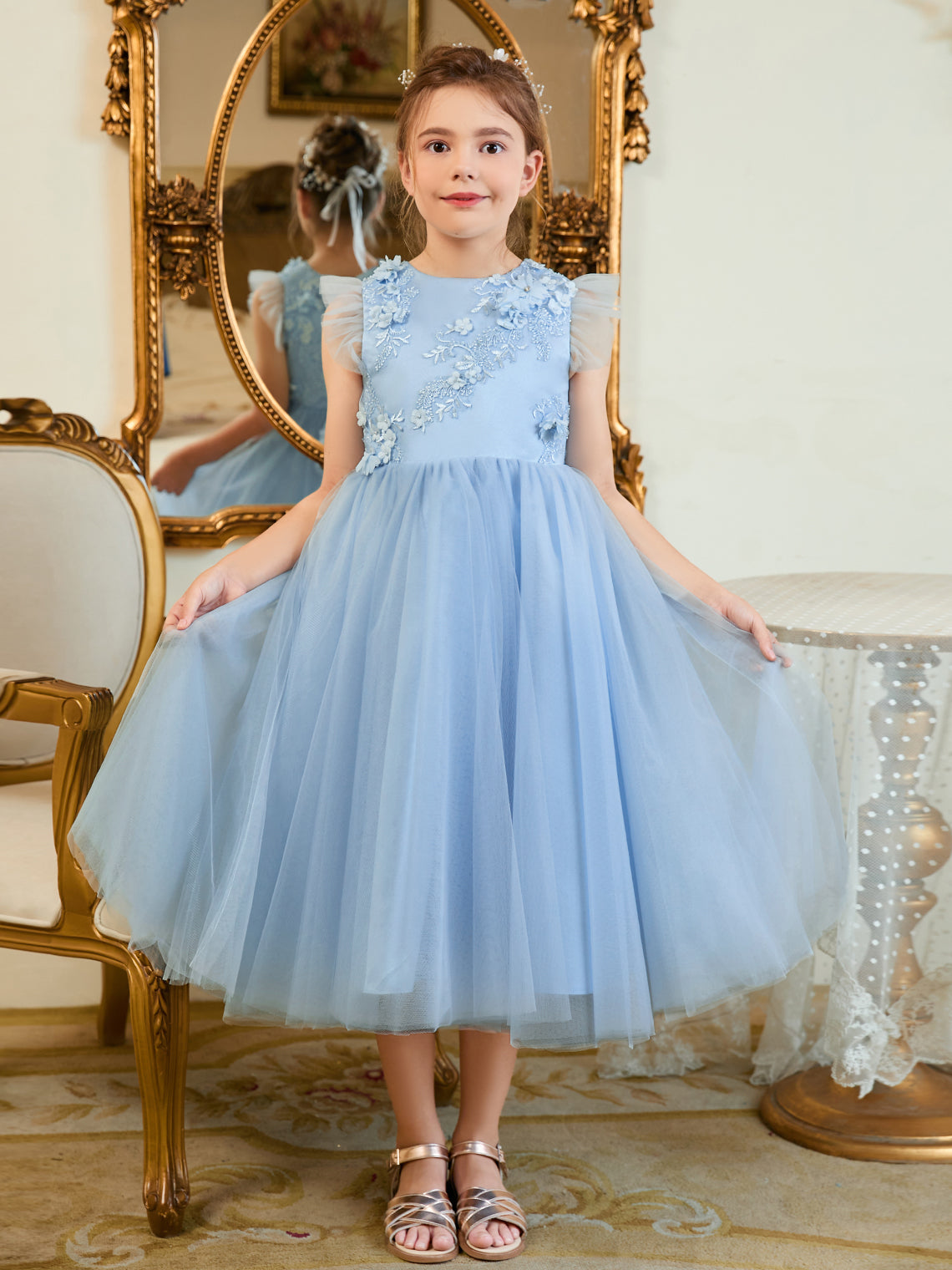 Ball-Gown/Princess Satin Tulle Tea-length Blue Dress (2003225970)