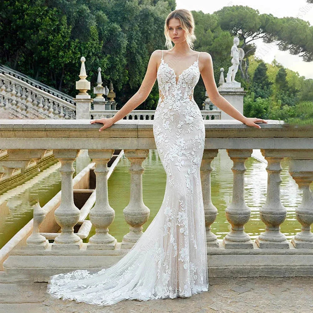 Beautiful Lace Sexy Off Shoulder Elegant Mermaid Sleeveless Deep V-neck Mop Wedding Dresses Strapless Bohemia Bridal Gowns