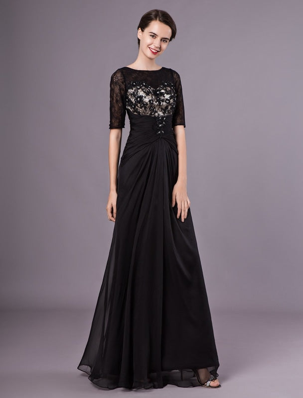 Black Evening Dresses Half Sleeves Lace Beading Chiffon Long Formal Gowns Wedding Guest Dress