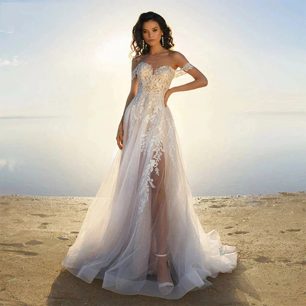 Bohemia Off Shoulder Wedding Dresses Women's Elegant Sleeveless Retro Sweet Lace Decal A-Line Backless Bridal Gowns Vestidos De